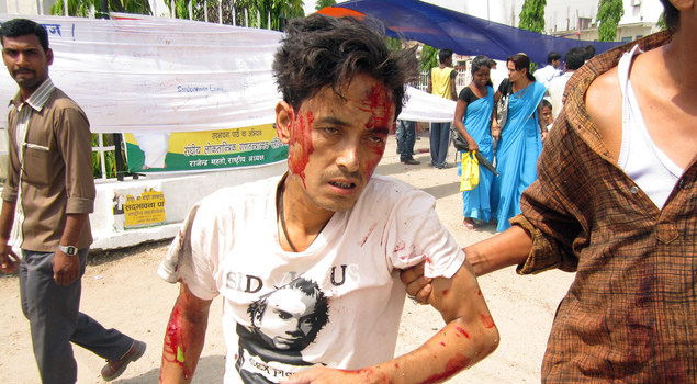 A wounded man is led away from the blast site where a bomb attached to a motorbike exploded, killing four protesters, in the southern Nepalese city of Janakpur on April 30, 2012.